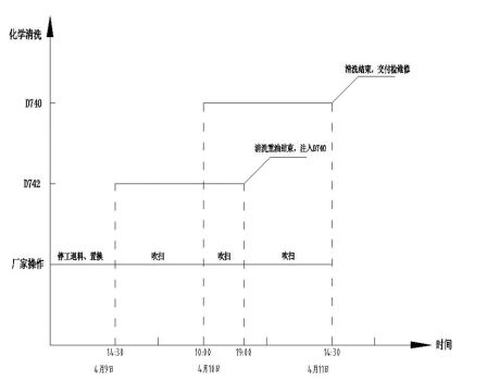 各注入點首先向系統內注入D742,乳化系統內重油,持續清洗4小時,待D742清洗結束后,更換試劑,使用D740,試劑進入裝置后使用專用試紙檢測清洗情況,持續清洗12小時直至清洗結束。