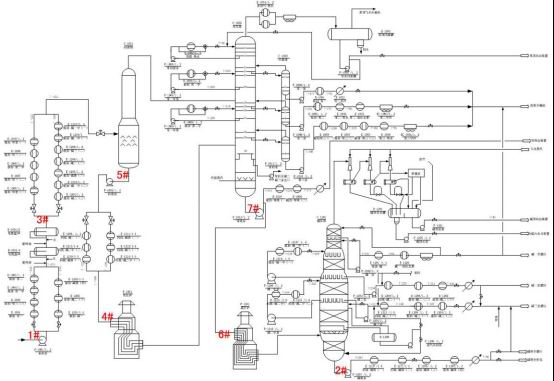 裝置開始降溫降量后,常減壓裝置各系統陸續開始停工退油,主流程引柴油置換,閉路循環升溫清洗,此過程區別以往化學清洗,不進行加劑,閉路清洗結束后退柴油。基本退油結束后,三塔(閃蒸塔、常壓塔、減壓塔)進入蒸塔階段,通過6小時蒸塔,將主流程內需要清洗的裝置(閃蒸塔系統、常壓塔系統、減壓塔系統)溫度提升至100-130℃;條件具備后,進入到加劑階段,其中加劑點7處,具體如下圖: